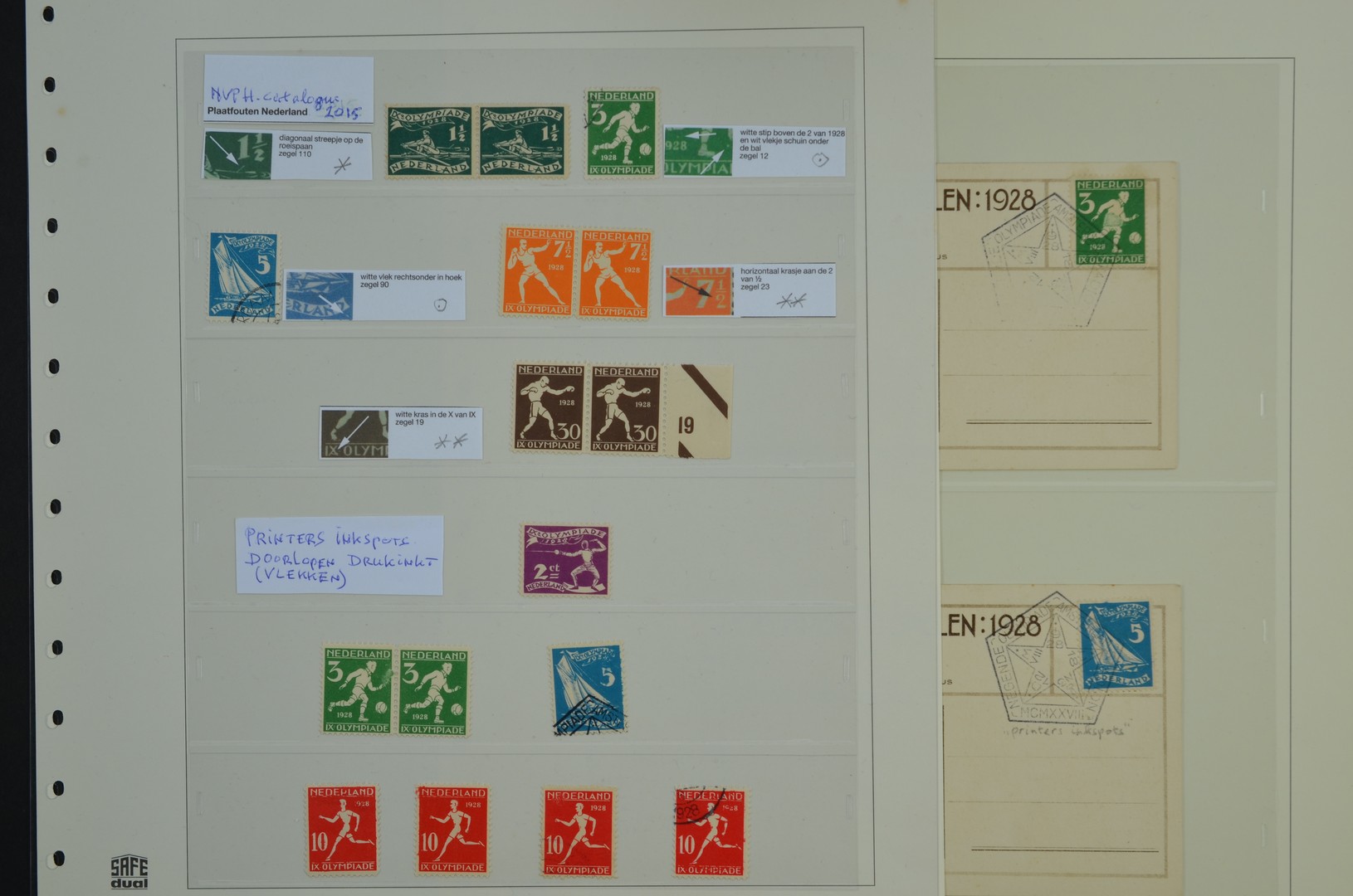 Olympische Spelen 1928, Plaatfouten 212P*, 214P, 215P, 216P**, 219P**, alsmede drukinktvekken op de 2c, 3c op kaart, 5c los en op kaart, 10c (w.o. half hoofd weg). Cat. van alleen de plaatfouten € 1005