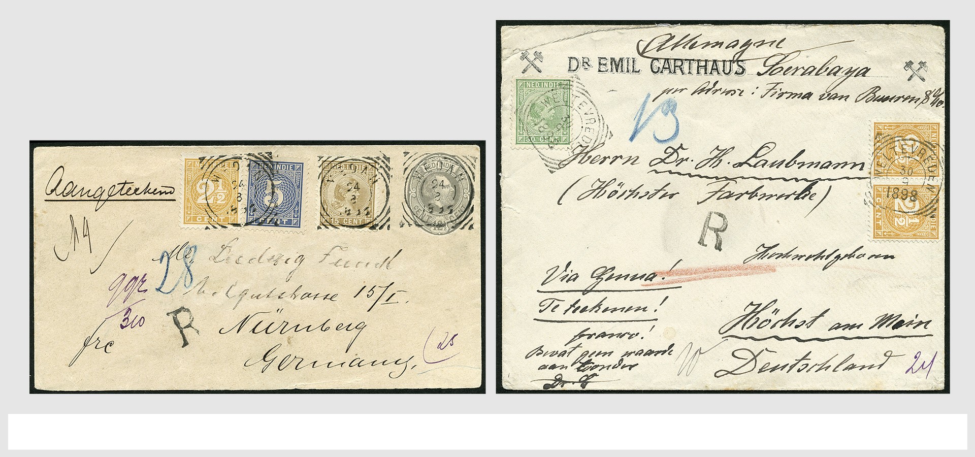 NED.- INDIË POSTHISTORIE, Wilhelmina met Hangend Haar, verzameling van 28 poststukken (2 vz.) alle gefrankeerd met type Hangend Haar waarbij mooie (enkel)frankeringen, combinatie- en mengfrankeringen, zwaardere poststukken met hogere frankeringen, stempels, aangetekend, allemaal met buitenlandse bestemmingen, censuur, etc.