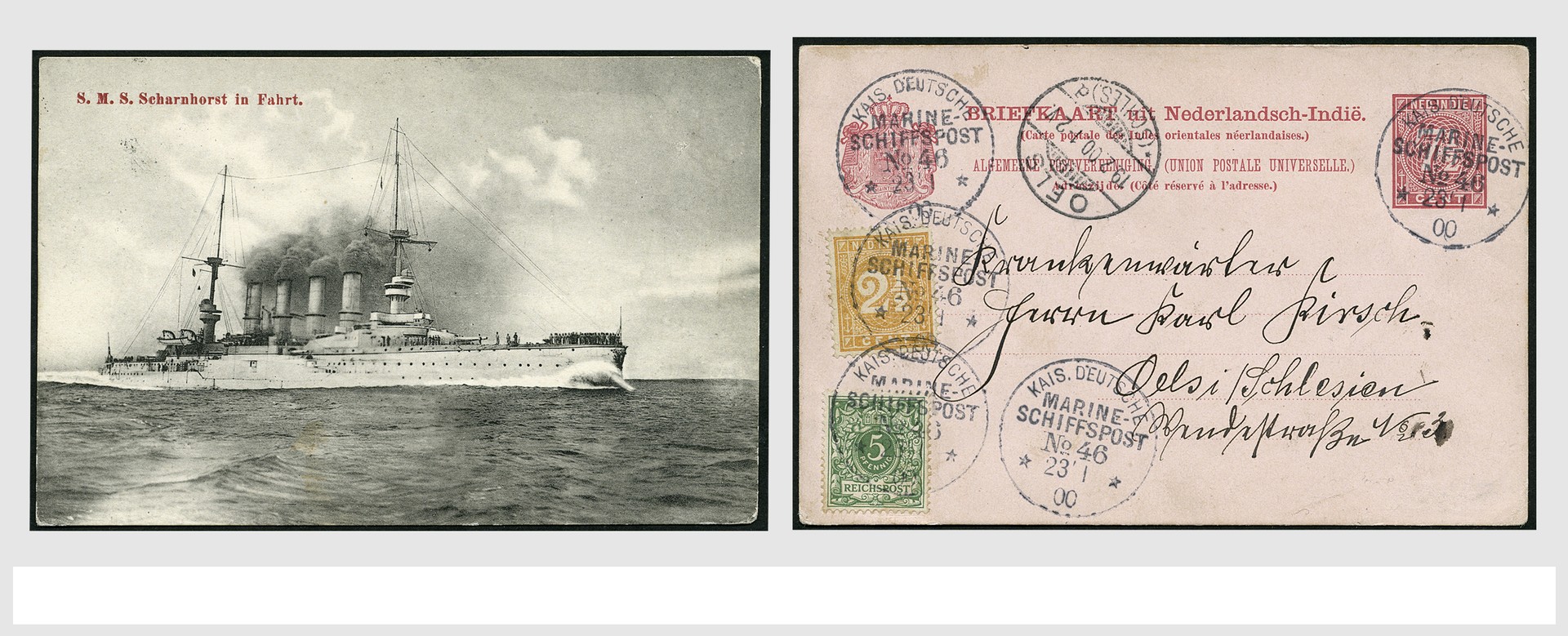 NED.- INDIË POSTHISTORIE, Duitse Marine in Azië, 5 bijzondere poststukken zoals beschreven en afgebeeld in het artikel ´Vreemde eenden in de bijt. Duitse oorlogsbodems in Indische wateren (1899-1914)´ door Han T. Siem (artikel bijgevoegd). Bijzonder en schaars materiaal!
