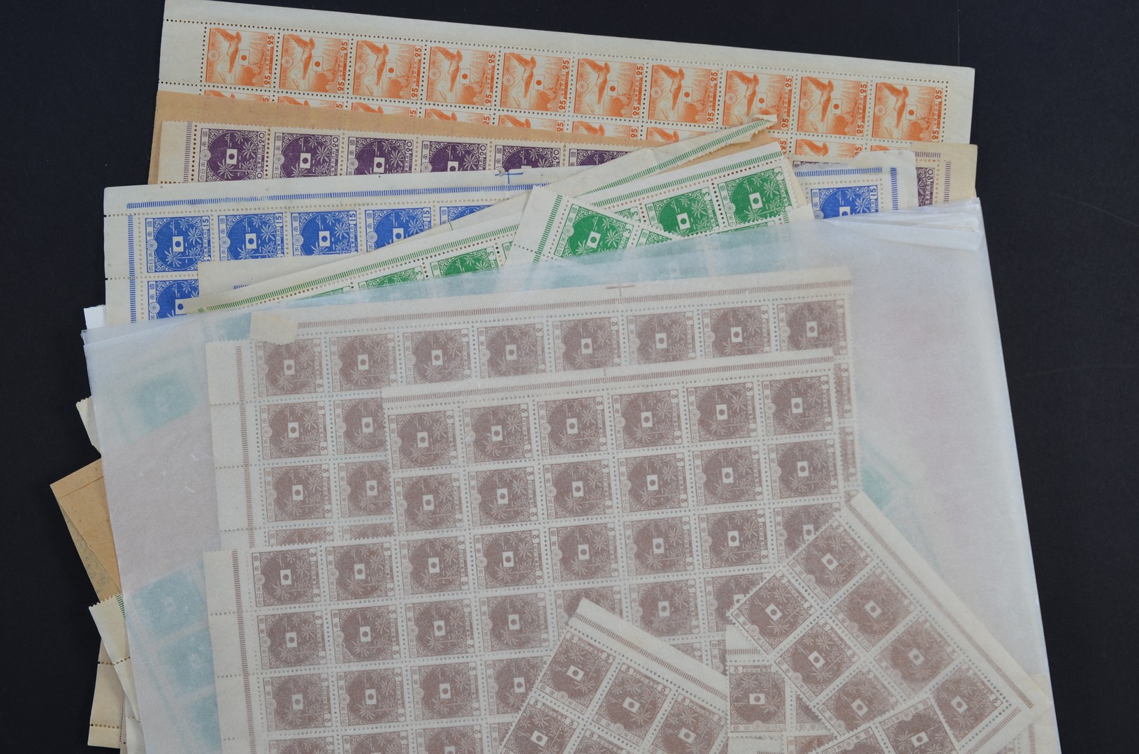 JAPANESE OCCUPATION 1942-1945, Definitive issue for the Navy Occupied Area nos. 01/11 mint in parts of sheets and/or full sheets in unequal numbers (60 copies of the 1 gld, cat value € 1500)