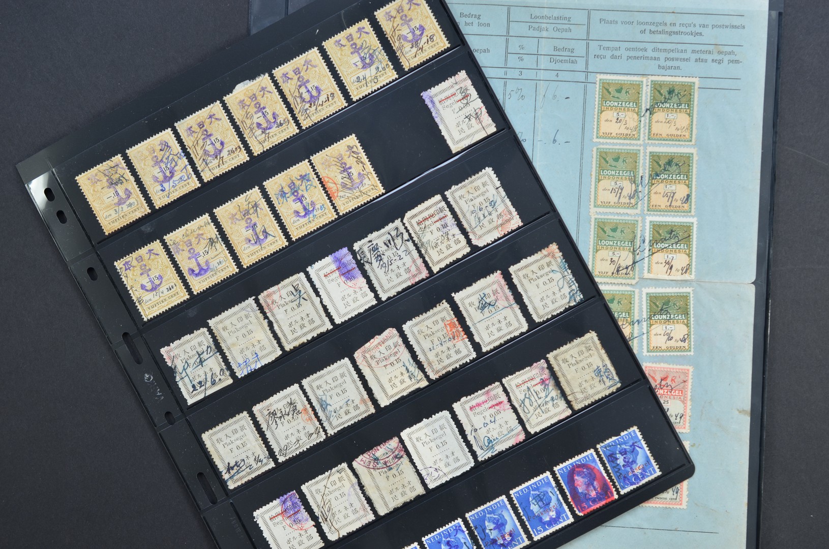 JAPANESE OCCUPATION 1942-1945, Revenues used on Borneo showing anchor overprints, definitive documentary and wage revenues, and also Indonesia wage revenues on form 1948-49 and banknote 250R issued Kutaradja 1 Maret 1949