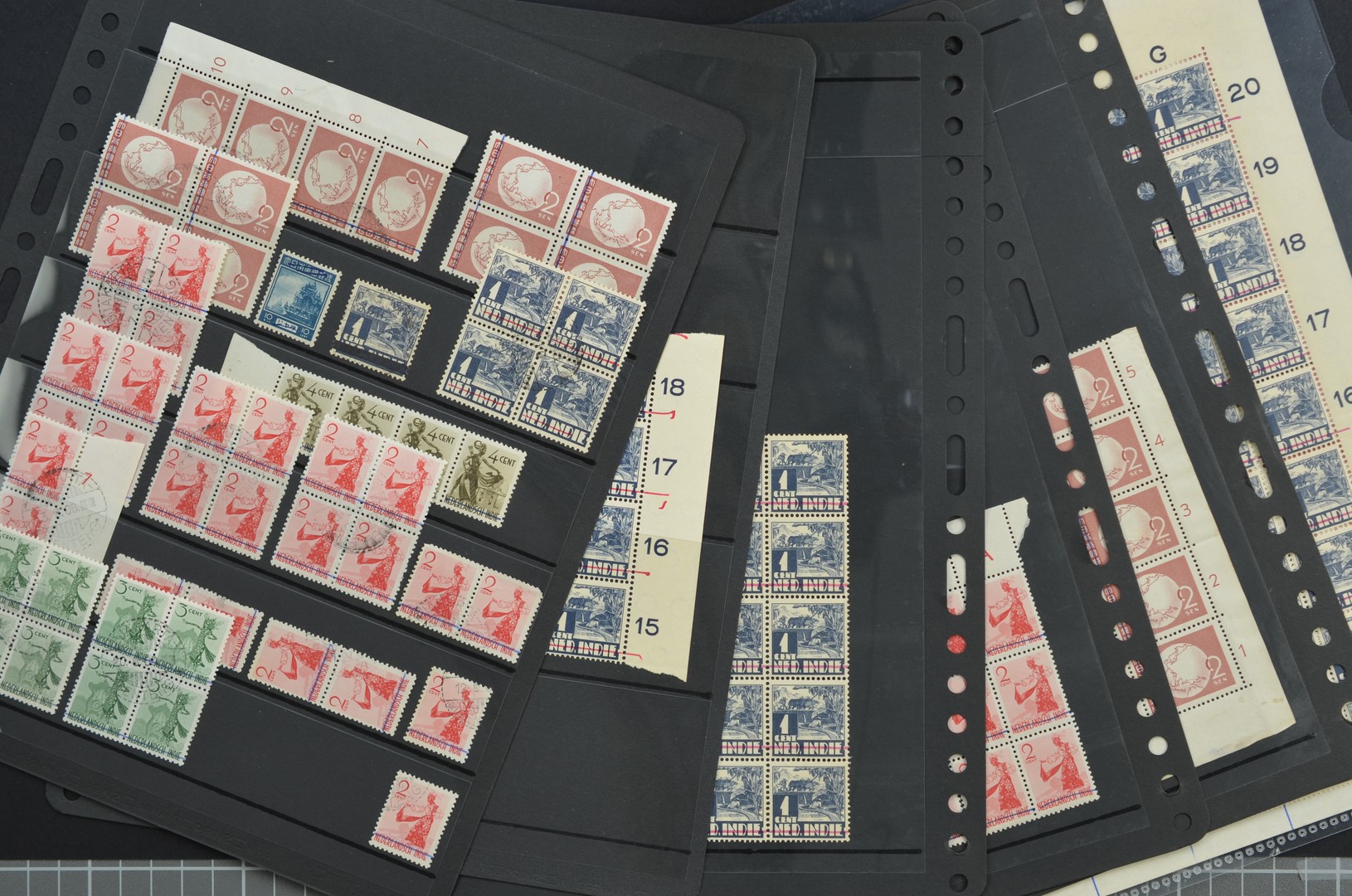 REPUBLIK INDONESIA 1945-1949, JAVA, stamps of the Neth Indies and Japanese occ in numbers or parts of sheets (Nos. 15b, 66, 68, 69, 72 and 78) all with ink or pencil line, 1 brush stroke, through former country name, mainly unused, few c.t.o. Djakarta-/Menteng