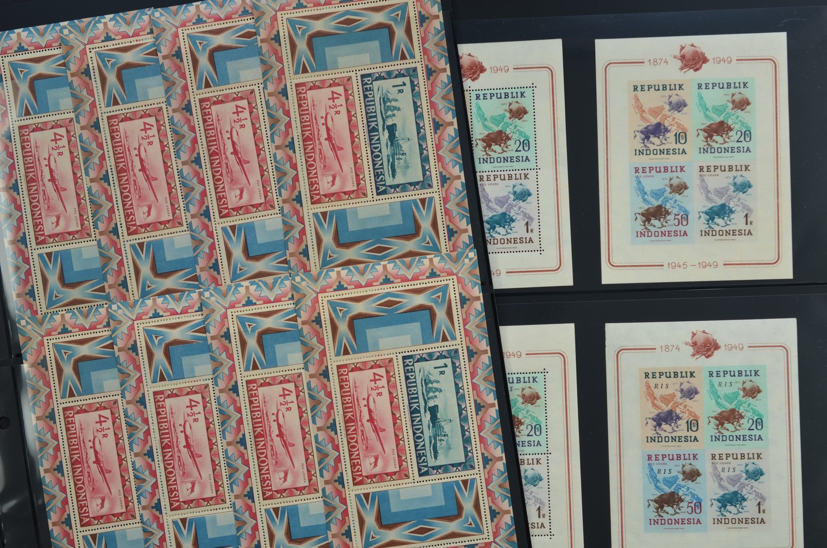 INDONESIA, Vienna Printings, Commemorative sheets 19-03 (8x) and 35-31 (9x), and all 4 UPU-sheets perforated and imperforated. € 890