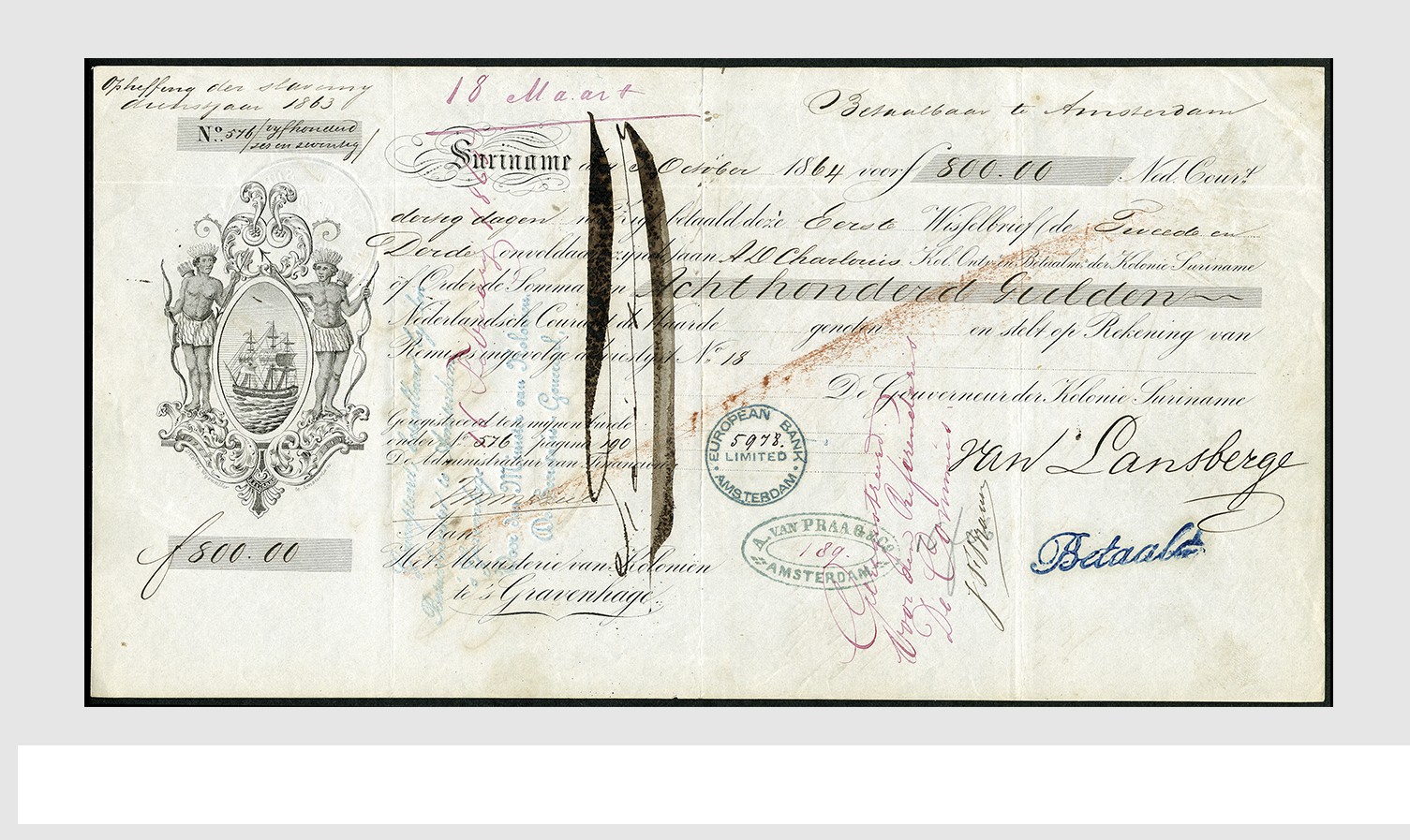 SURINAME, drie prachtig bewaard gebleven wisselbrieven voor het vergoeden van vrijlaten slaven, uitgeschreven in 1864 en ondertekend door de Gouverneur der Kolonie Suriname R.F. van Lansberge. Tevens van Ned.- Indië een kwitantie uit 1876 en twee bij elkaar horende wisselbrieven uit 1882, alle uitzonderlijk mooi van kwaliteit!