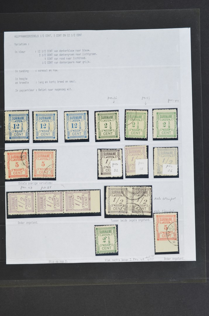 SURINAME, Hulpuitgiften 1909 en 1912, kleine verzameling inclusief tandingvariëteiten nrs. 65v ongebruikt (2x), 67v gebruikt, 65va gebruikt, en 2 poststukken, op 3 bladen