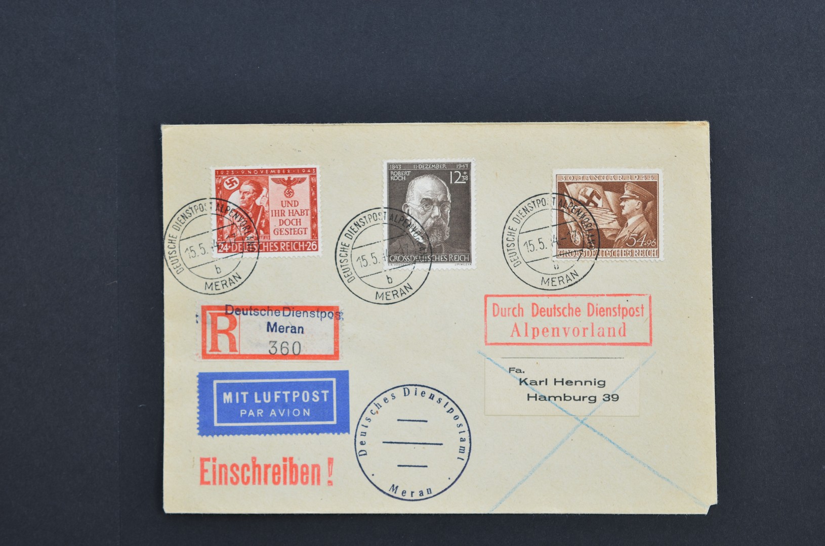 DUITSLAND. Mooi gefrankeerd couvert afgestempeld 'Deutsche Dienstpost Alpenvorland' 15-5-1944 aangetekend en per luchtpost naar Hamburg 19-5