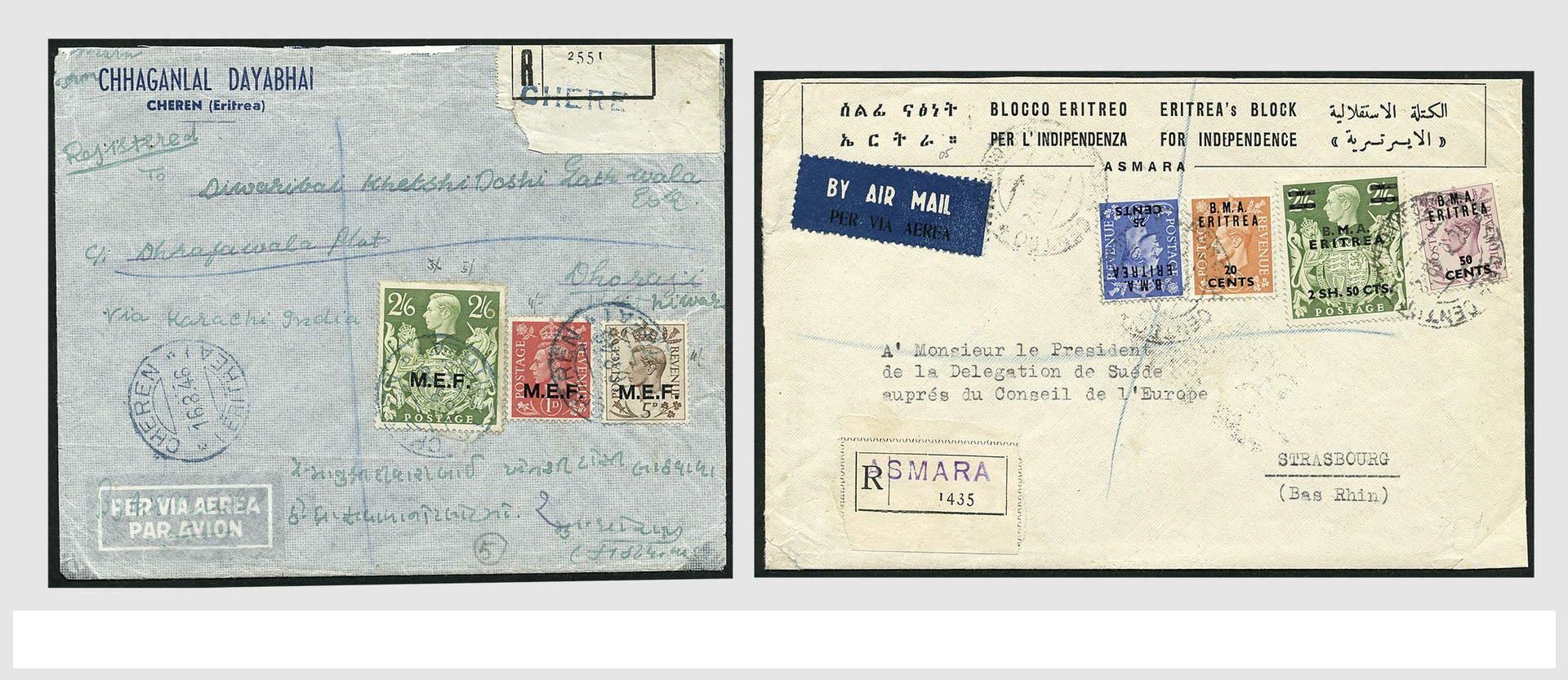 ENGELSE KOLONIËN, Eritrea, o/*/** collectie op albumbladen met goede series en 7 echt gelopen brieven, waarbij met censuur
