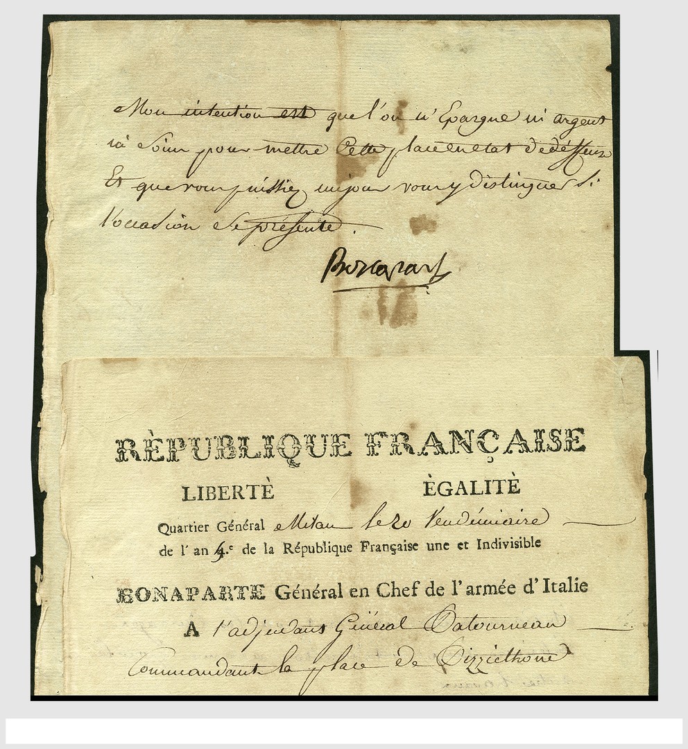 FRANKRIJK, Napoleon Bonaparte. Document geschreven te Mitau, 20 Vendémiaire de l´an 5e de la République, deels bedrukt met ´BONAPARTE Général en Chef de l´armée d´Italie´ en ondertekend door de keizer zelf met ´Bonaparte´. Historisch!