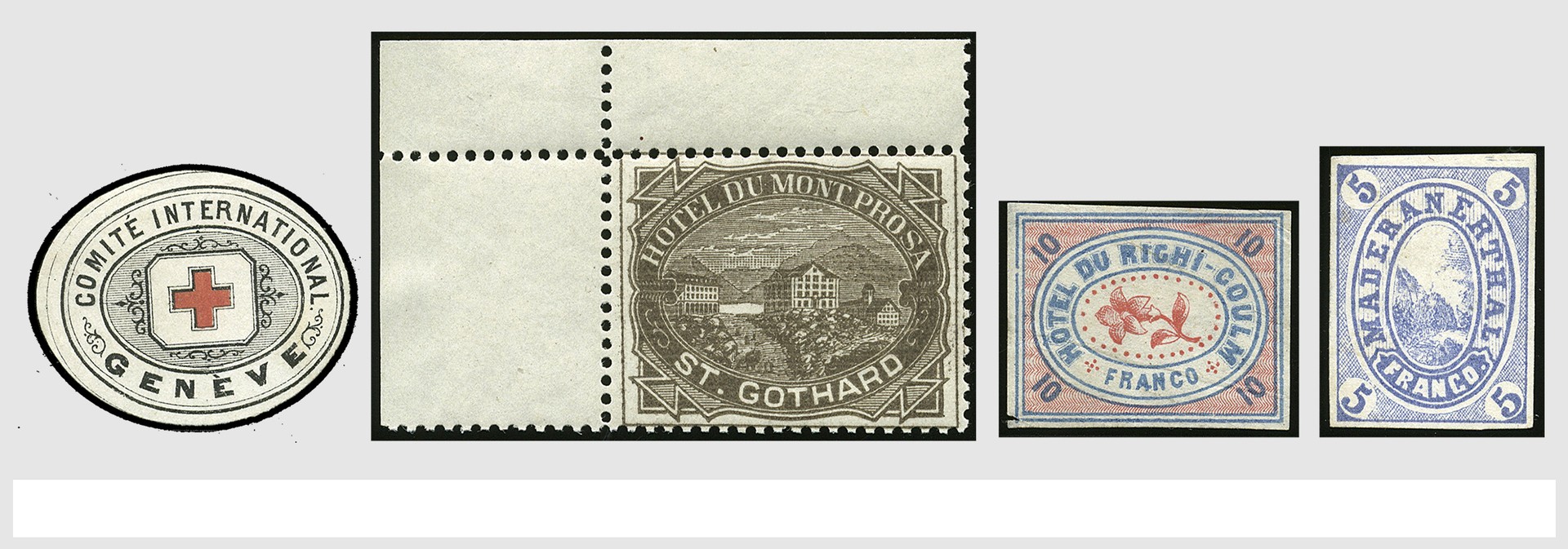 ZWITSERLAND, Hotelpost wb. St. Gotthard Zu.2, Portofreiheit wb. voorloper Geneve Zu. XI, div. proeven en o.a. 'Eisenbahnmarken wb. Voorloper Jura Zu. II. Leuke koop met niet alledaags materiaal