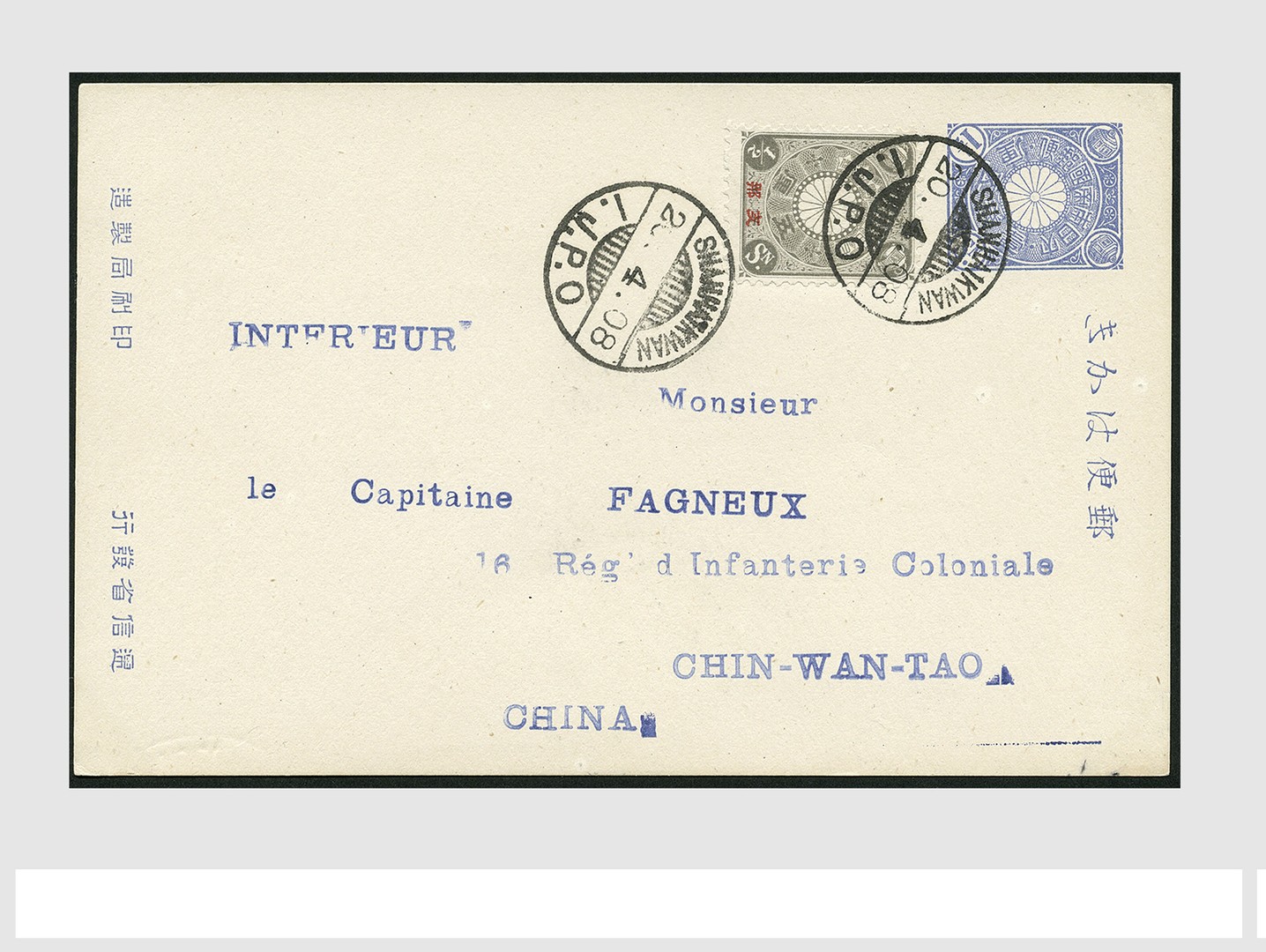 CHINA, 2 briefkaarten en 1 postblad met luxe verzoekafstempeling SHANHAIKWAN/I.J.P.O. 20-4-1908 naar Chin-Wan-Tao