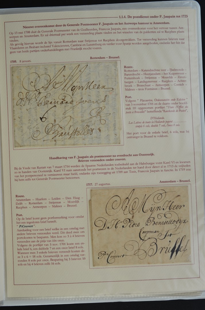 POSTHISTORIE, op de Hertogpost 2010 met goud bekroonde tentoonstellingscollectie "De Postgeschiedenis van de Lage Landen tot 1813" van A.H.M.H. van den Brink. Overgebleven gedeelte bestaande uit 63 poststukken 1594-1812, met diverse postale aanduidingen, portverklaringen, routes, afstempelingen, Corsini-archief, etc. Allemaal van zeer goede kwaliteit en uitgebreid gedocumenteerd. Prachtobject!