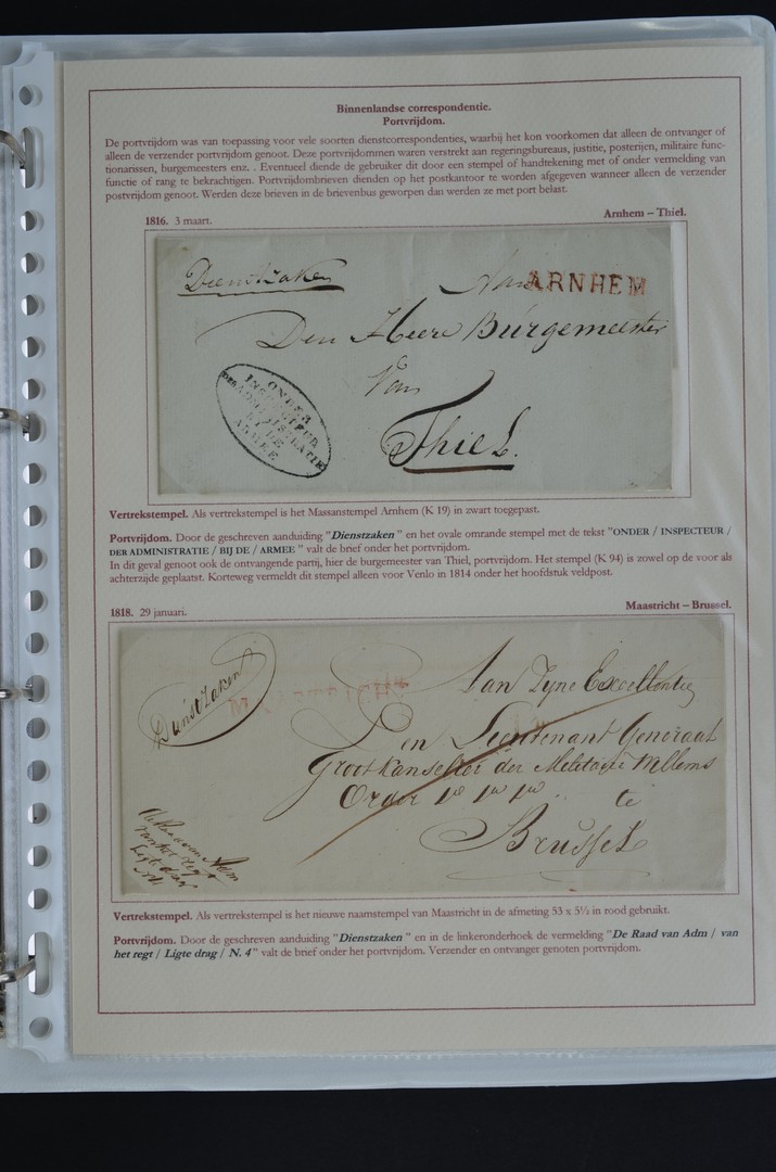 POSTHISTORIE, Tentoonstellingscollectie "Nederland 1813-1852" van A.H.M.H. van de Brink, bestaande uit 95 poststukken, uitsluitend in uitgezochte luxe kwaliteit en zeer gedocumenteerd beschreven met betrekking tot de postale aanduidingen, portverklaringen, routes, afstempelingen, historische betekenissen etc. Een prachtobject om uit te breiden, in 3 ringbanden. Iedere liefhebber van de oude Nederlandse postgeschiedenis adviseren wij de collectie goed te bekijken.