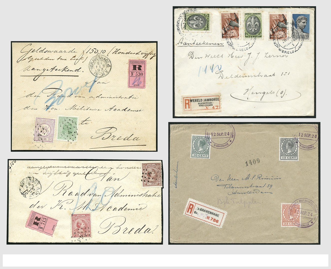 Uitgebreide verzameling van 1280 stuks Aangetekende brieven ca. 1875-1995 met vrijwel uitsluitend verschillende aantekenstroken van vaak kleinere plaatsen, tentoonstellingen, o.a. 1924 (2x), Congressen veelal ook met speciale gelegenheidsstempels, vele goede enkel-, combinatie-, en mengfrankeringen, goede brieven met Hangend Haar, Bontkraag, emissie 1923, type Veth enz. Veel zakenpost, belangrijk periode 1940-1945, ook 50-er jaren en moderne uitgiften aanwezig. Een uitzonderlijke prachtkoop, ideaal om te detailleren! Zeer hoge waarde!