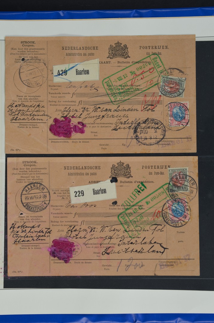 POSTHISTORIE, verzameling van ruim 95 post(waarde)stukken met type Bontkraag w.o. (enkel)frankeringen, antwoordbriefkaarten uit buitenland, stempels (o.a. kleinrond en grootrond) waarbij van kleine hulppostkantoren, adreskaarten (2), etc. in Lindner-ringband