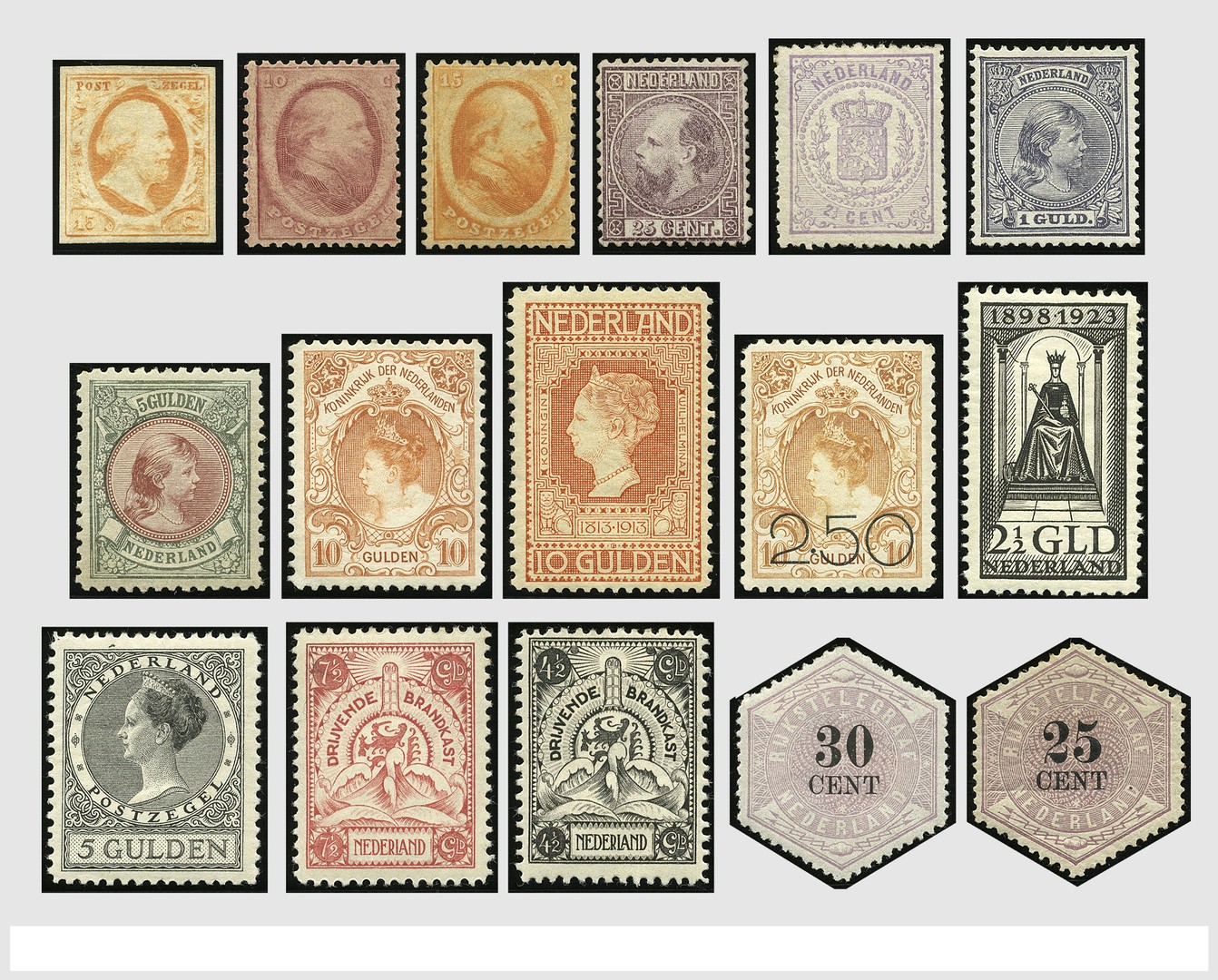 1852-1969, */** in Davo de Luxe wb. 1/3, 4/6, 11(nagegomd), 13/18, 30/33, 34/48, 56/80, 90/101, 104/105, 121/131, 144/165, periode 1927-1969 compleet, Rolt. 19/31, 33/70, Brandkast 1/7, Dienst 1/8 en o.a. Telegram nr.7. Een waardevolle prachtkoop met enorme cataloguswaarde!