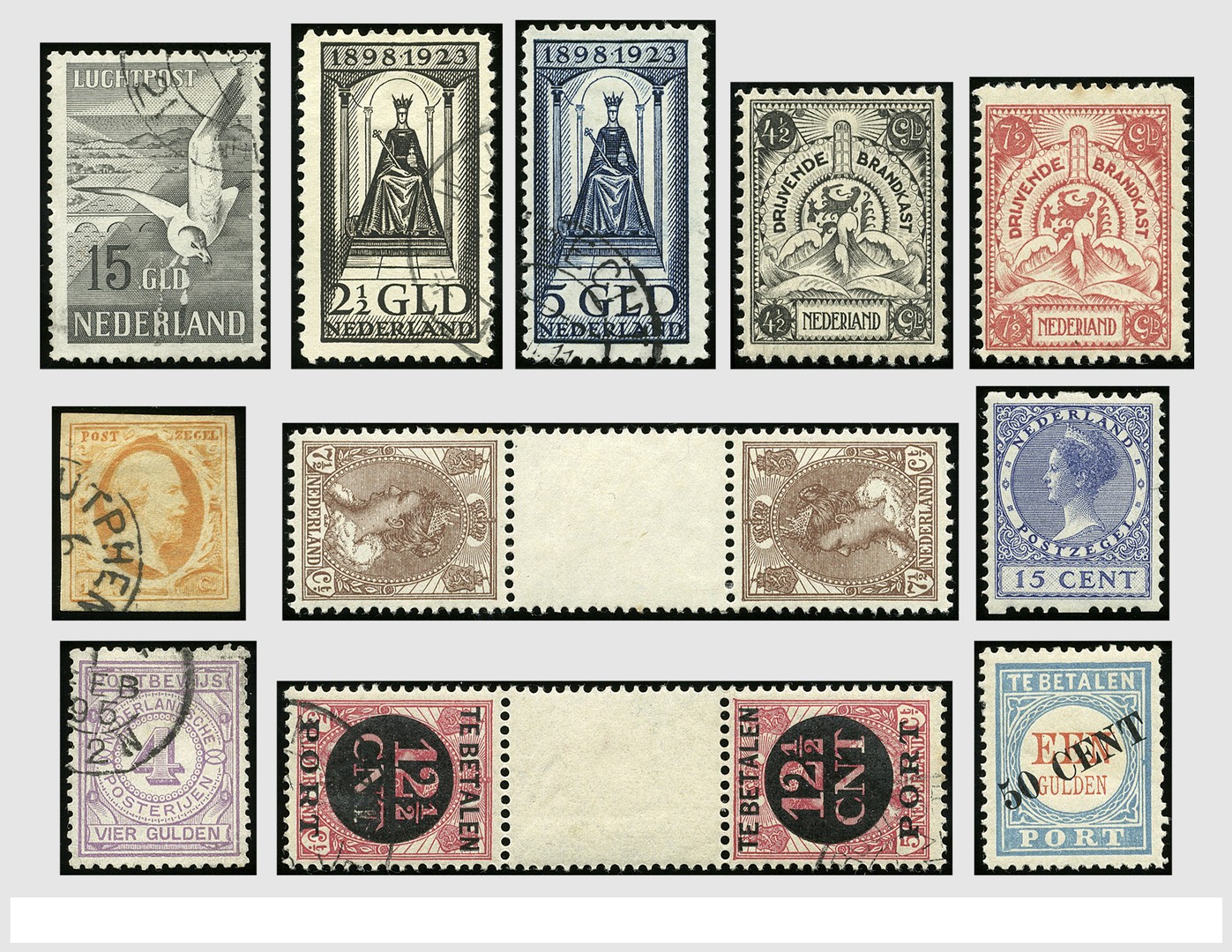 1852-1976, o/*/** collectie in gevarieerde kwaliteit met o.a. 1/12, 61b/c, 104/105, 130/131, Brandkast 1/7, Pbw. 1/7, Int.1/2, Port 67a/68b, Roltanding cpl. (ex. 32), in 2 Davo albums