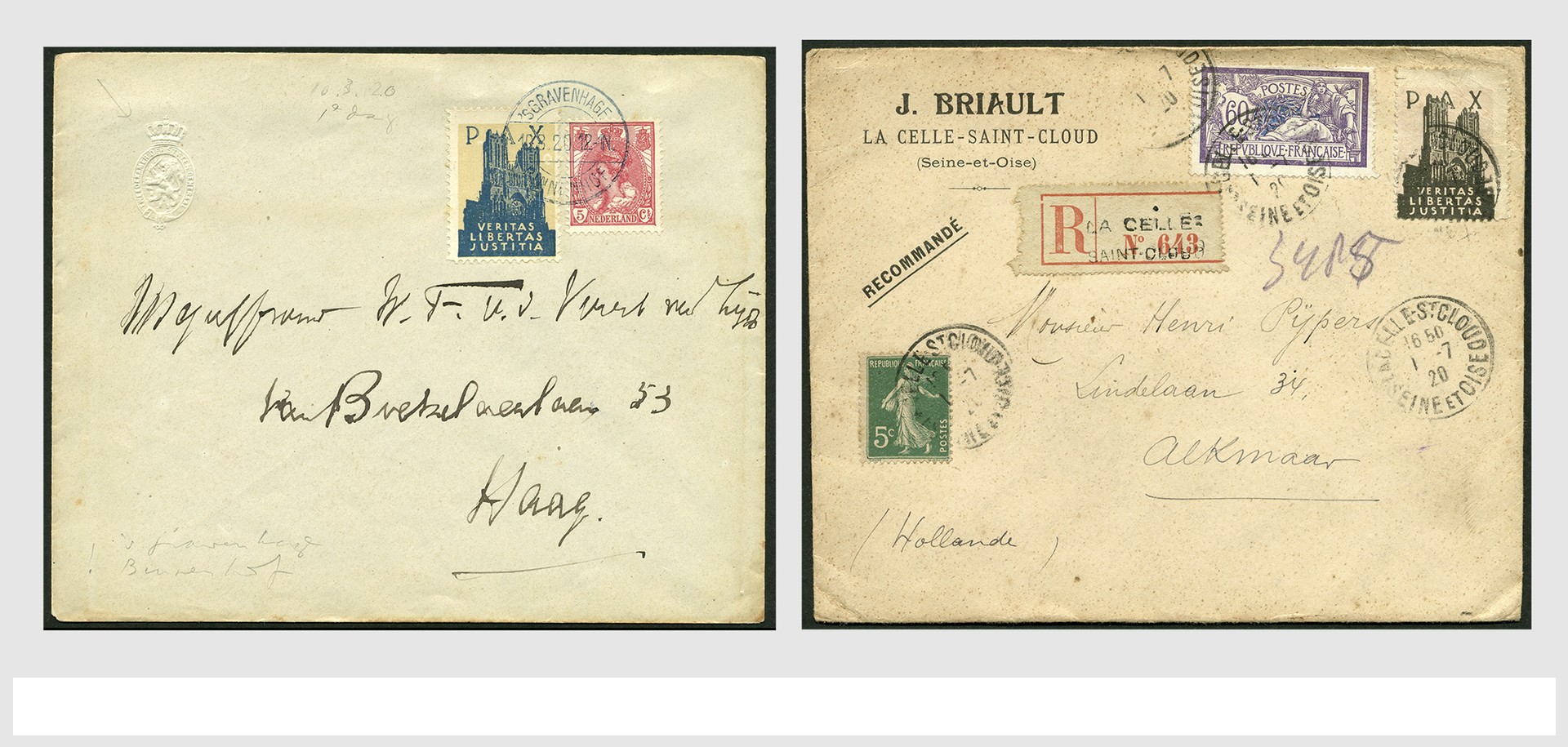 PAX-ZEGEL 1920, unieke studiecollectie van de Nederlandse Vredeszegel, uitgegeven van 10 t/m 23 maart 1920, een zegel zonder frankeerwaarde maar verkocht voor 5 cent als bijdrage aan de restauratie van de kathedraal van Reims, een symbool geworden voor de zinloosheid van het oorlogvoeren. De collectie omvat losse zegels in veldelen, 28 poststukken met een Pax-zegel waarvan 3 op de dag van uitgifte, zoals op couvert van de Tweede Kamer der Staten Generaal (mooi droogstempel), afgest. ´sGravenhage/Binnenhof 10.3.20.12-1N´ (zie afb.), enige buitenlandse poststukken met daar uitgegeven Pax-zegels (o.a. België, Colombia, Frankrijk), Franse prentbriefkaarten van de kathedraal, literatuur, documentatie, diverse extra´s, alles in ringband. Uitzonderlijk en interessant object om op te zetten! Ex Dr. J. Vos