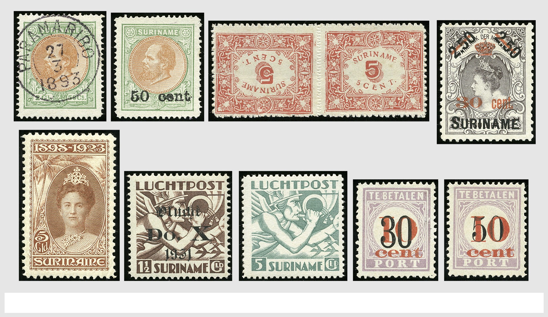 SURINAME 1873-1953. o/*/** vnl. ongebruikte collectie in Leuchtturm album met typen, tandingen en andere variëteiten. Bevat o.a. 37/40, 58a/59a, 60/64, 104/110, 115f, 132f, 229/243, Lp.8/14, Lp.18, Port 15/16 type I en III, het geheel opgefleurd met ca. 65 ongebruikte postwaardestukken