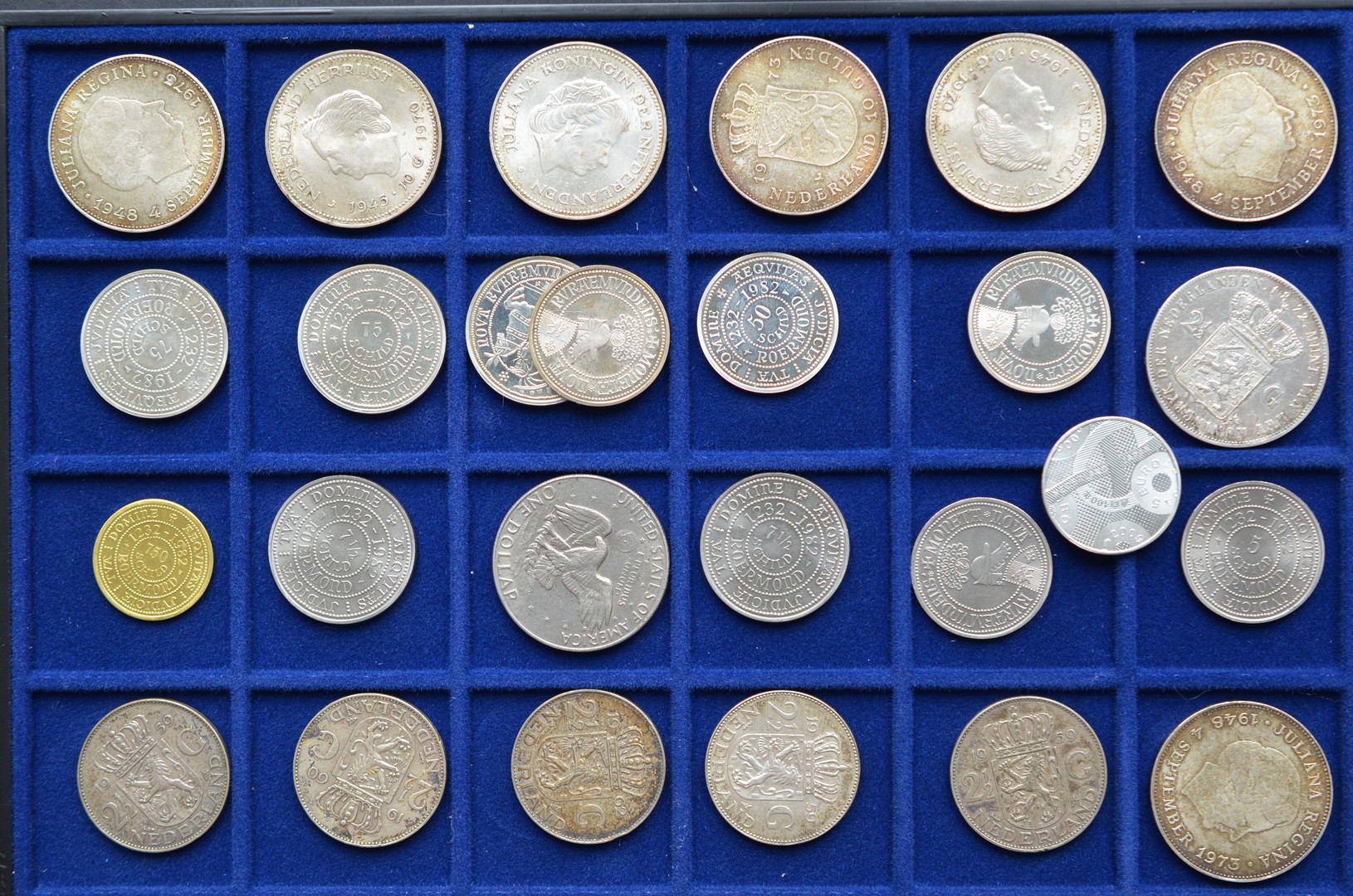 NEDERLAND, casette met Zilveren munten en penningen alsmede Gouden penning "750 jaar Roermond" 750 schild. (10.1 gram .900)