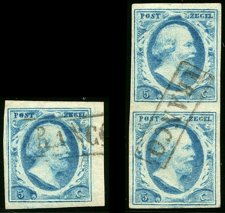 1q, 5 Cent plaat VI op dik papier, 10 losse ex. pos. 8, 9, 10, 13, 14, 15, 16, 19, 21, 23 en 1 paar pos. 15/20