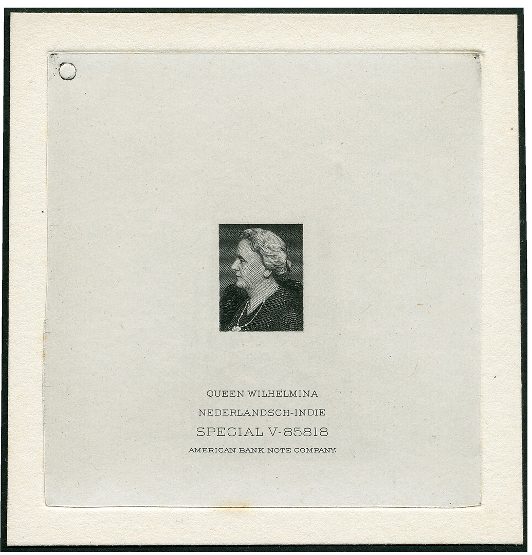 PC 284, stempelproef op dun papier van de American Bank Note Co., geplakt op kartonnetje met portret van Koningin Wilhelmina met tekst: 'Special V-85818" Hfl.750