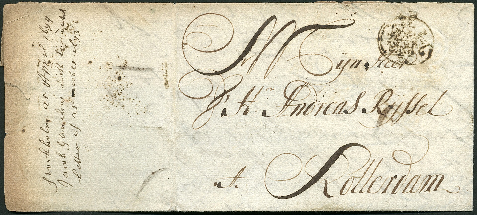 Vouwbrief geschreven te Stockholm 25-4-1694 (particulier overgebracht?) van Amsterdam naar Andreas Russell te Rotterdam, afgest. met 3-stuiverstempel (Adema A1, PEP.10510-01). 3-Stuiverstempels op buitenlandse brieven, en zeker uit Zweden, zijn zeldzaam!