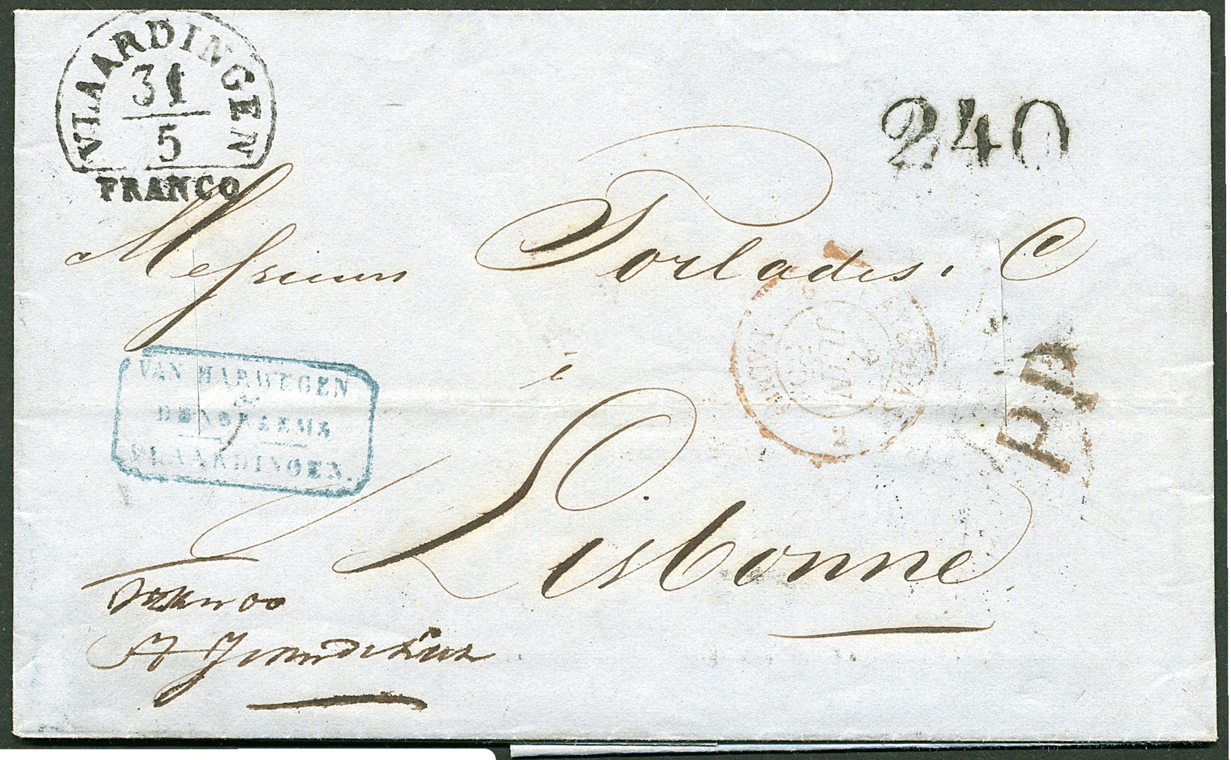 Gedesinfecteerd. Cpl. vouwbrief van Vlaardingen 31-5-1855 via Valenciennes 2-6 naar Lissabon 10-6 met op vz. naast het afz. stempel het te Parijs gestempelde portstempel ´240´ reis (VdL.3228) alsmede ´P.P.´ De brief is gedesinfecteerd wat blijkt aan de twee insnijdingen. Cover from Vlaardingen 31 May 1855 via Paris ('240' reis), to Lisbon 10 June, during the 3rd cholera pandemic period (1846-1862, Siem) disinfected which is shown by two disinfection slits