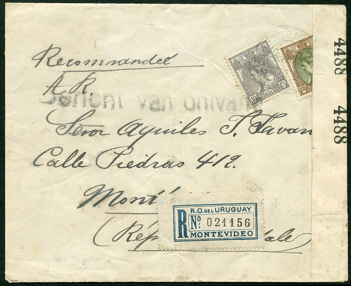 Buitenlandse R-strookjes op aangetekende Bontkraag-brieven. Env. (linksboven wat wild geopend) gefr. met 5c, 7½c en 17½c violet van Rotterdam 22-11-1909 naar Guadalajara, Mexico, 7-12 met een R-strookje van El Paso (Texas), en env. gefr. met 10c en 22½c van 'sGravenhage 2-12-1917 met stempel 'Bericht van Ontvang', gecensureerd over New York 2-1-1919 (!) naar Montevideo waar een strookje werd geplakt