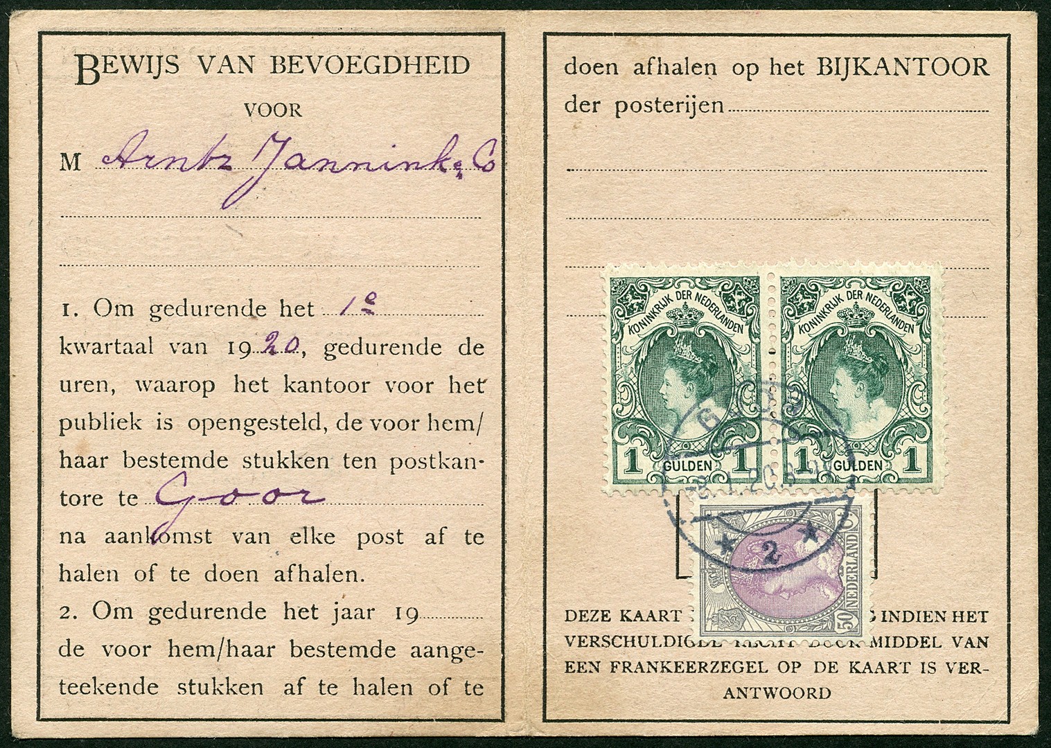 Postbuskaartje met Bontkraagzegels 50c nr. 75 en 1 gld nr. 77 in paar afgest. Goor 8-1-1920, voor het afhalen van stukken in 1e kwartaal 1920