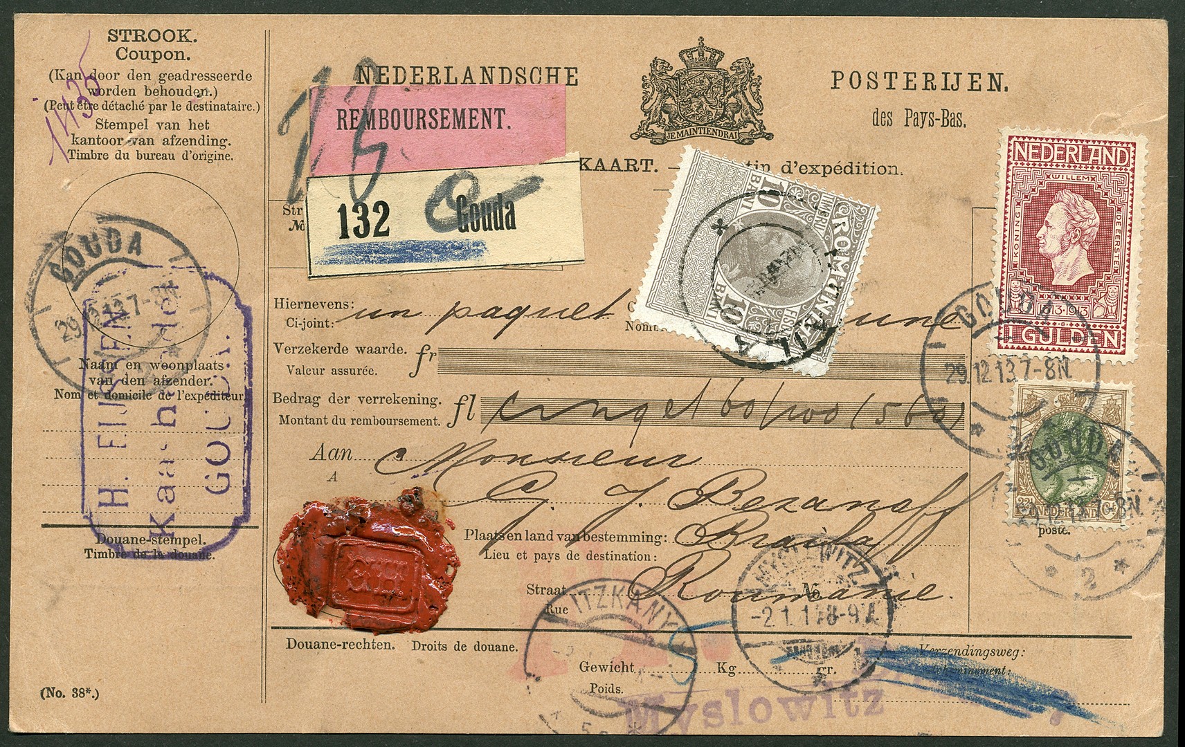 Cpl. adreskaart gefr. met 22½c Bontkraag en 1 gld Jub. '13 voor een pakket als verrekenzending van Gouda 29-12-1913 over Emmerich 30-12 en o.a. Myslowitz 2-1-1914 naar Braila in Roemenië 5-1, waar een fiscaalzegel van 10b is opgeplakt. Zeldzame kaart