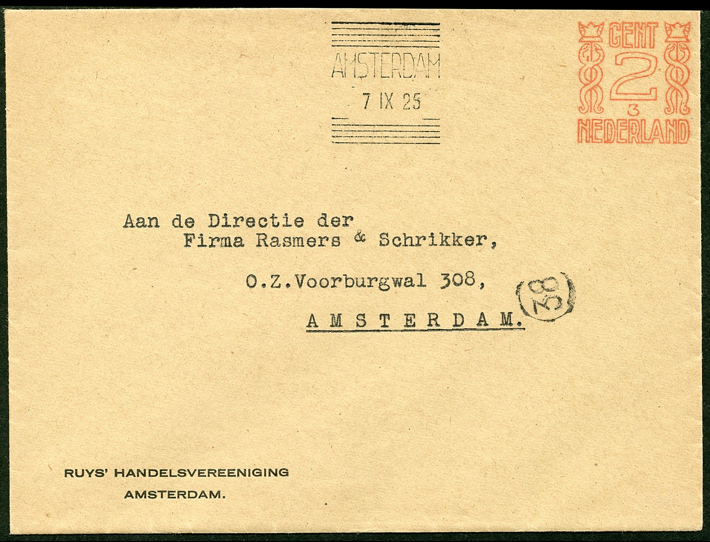 Eerste dag gebruik frankeermachine 7-9-1925. Drukwerkcouvert van Ruys' Handelsvereeniging met inhoud, een rondschrijven aan zakenrelaties waarin Ruys aangeeft de vertegenwoordiger te zijn van de 'Universal Postal Franker' in gevolge een overeenkomst met de Posterijen. Tevens prijst Ruys nog twee machines aan voor het maken van circulaires en adresseren van poststukken. Bijzonder geheel en een 'must-buy' voor verzamelaars van roodfrankeringen