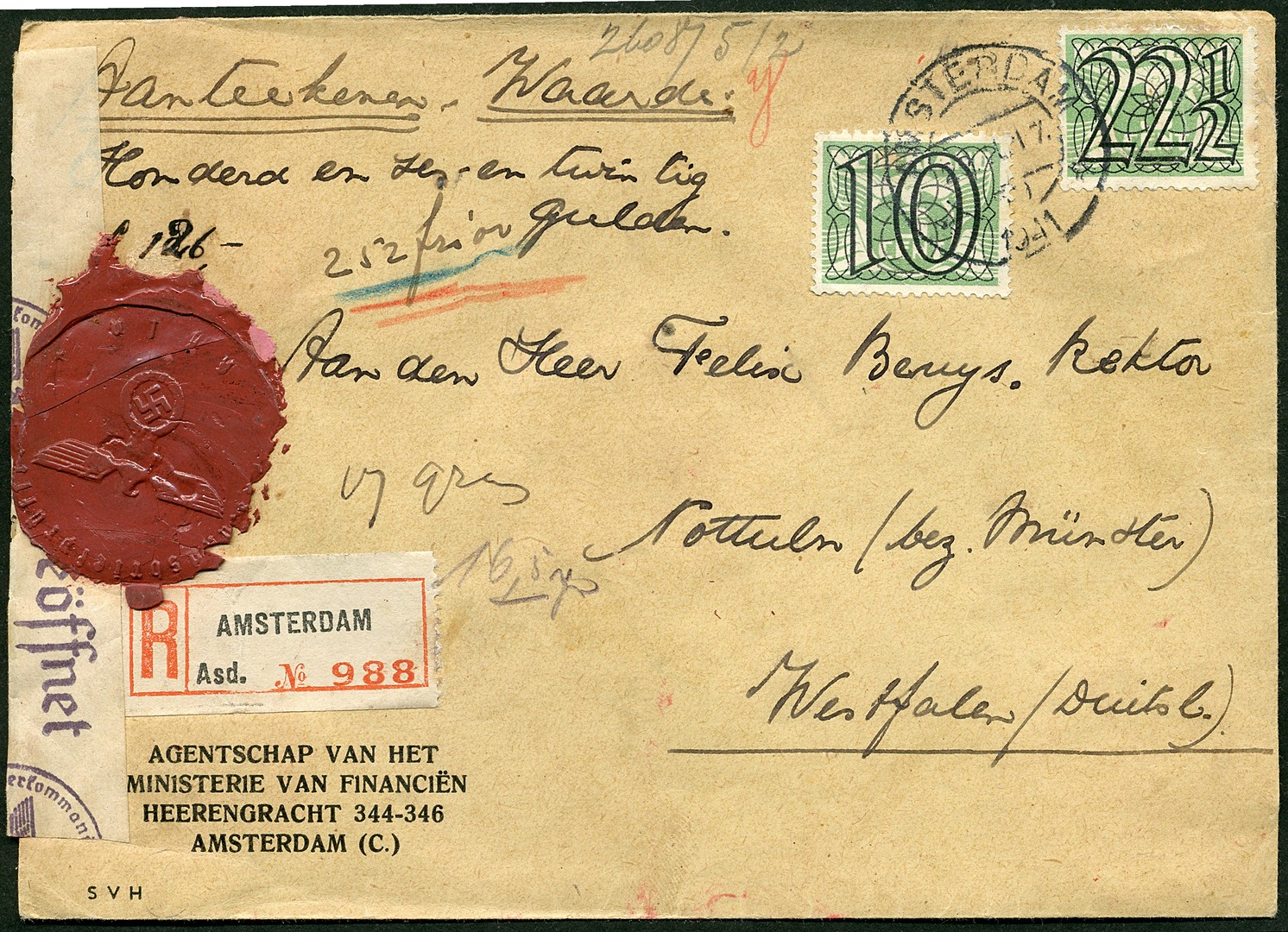 Env. van het Agentschap van het Min. v. Fin. van 16,5 gram gefr. met Guilloche 10c en 22½c als waardebrief (fl. 126) van Amsterdam 23-2-1941 naar Nottuln 3-3, gecensureerd en gesloten met strook waarop 3 lakzegels met stempel van Rijksadelaar ingedrukt. Op az. tevens 3 mooie lakzegels van het Agentschap