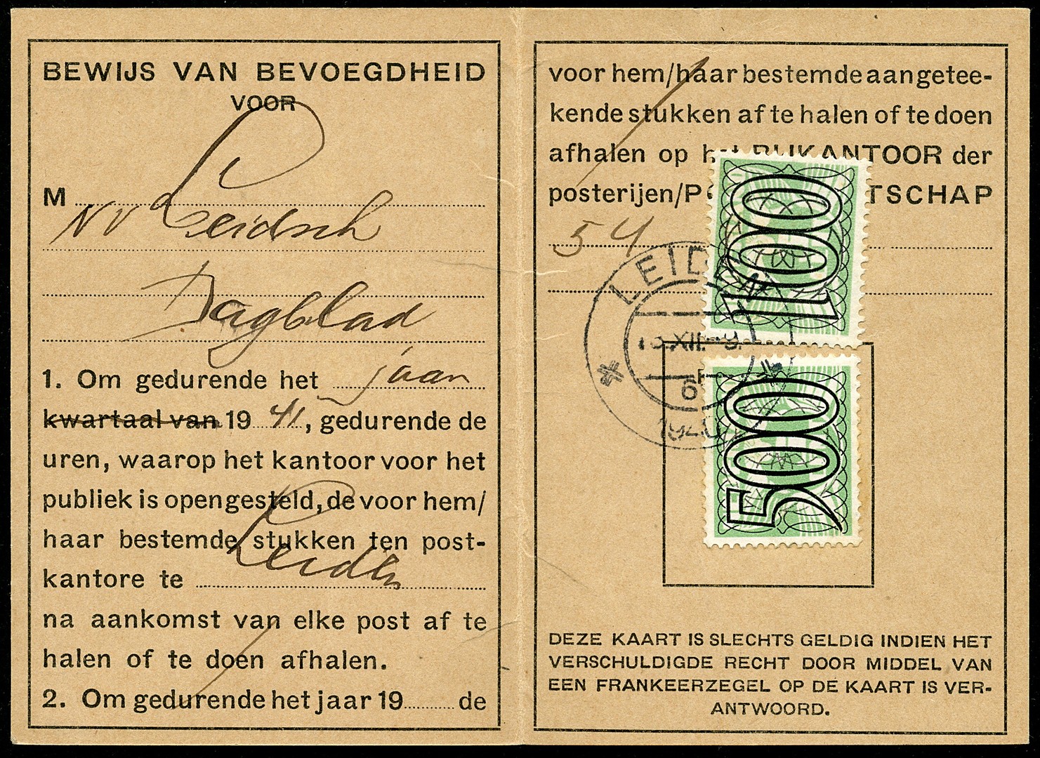 Postbuskaartje met 100 en 500 cent Guilloche nrs. 371 en 373 afgest. Leiden 13-12-1940, voor het afhalen van stukken gedurende gehele jaar 1941. Schaars!