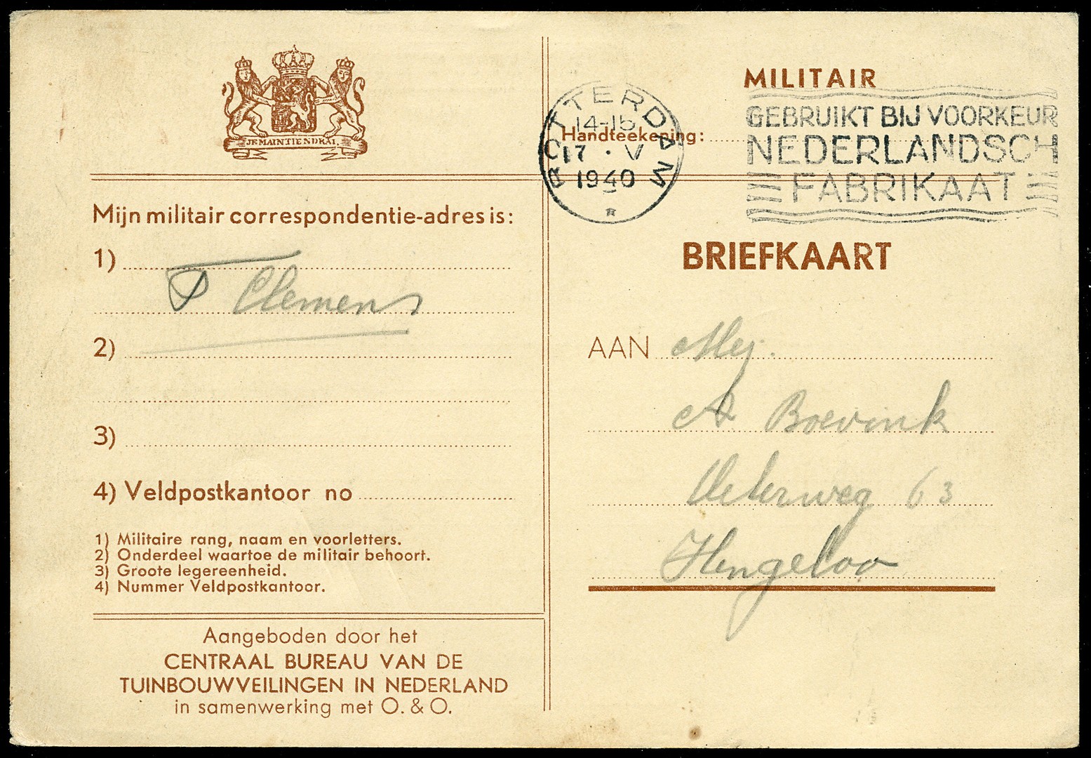 Particuliere veldpostkaart (Centr. Bur. Tuinbouwveilingen) van Frans, die in Rotterdam 2 dagen na het bombardement aan Annie in Hengelo schrijft ´Als deze briefkaart over komt weet ik niet, ik wil het hopen.´ De kaart is op 17 mei 1940 in Rotterdam afgestempeld. Historisch! Tevens bk. van ´sGravenhage 2-6-1940 naar de in Duitsland geïnterneerde oberleutnant Tobi de Jong