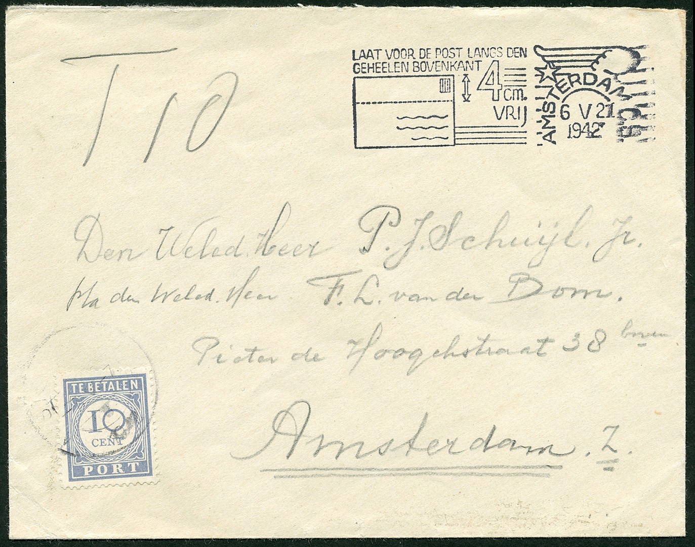 Env. (klep met 2 plakkers vast) van gevangene P.J. Schuijl, Zelle 2, Wehrmacht Kriegs Haftanstalt te Maasticht naar Schuijl jr. te Amsterdam, daar op 6-5-1942 afgest. en op 7-5 met 10c beport. Op az. staat met potlood ´Geprüft´ + paraaf. Is dit Pieter Johannes Schuijl, geboren op 28-2-1886 en op 11-5-1942 als oorlogsslachtoffer overleden in Sachsenhausen?