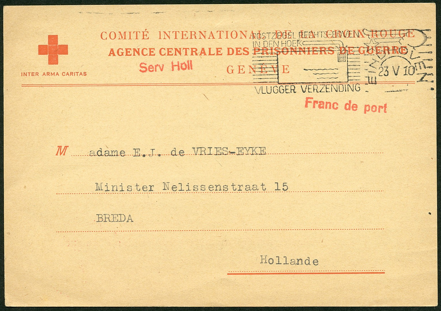 Rode Kruis. Bk. van het Int. RK Genève 1-5-1945, afgest. Eindhoven 23-5, naar Breda met bericht dat echtgenoot J. de Vries krijgsgevangene is in Duitsland. Tevens twee verschillende bevestigingen van ontvangst pakket levensmiddelen (´Kriegsgefangenenpost´ uit 1943, 1944)