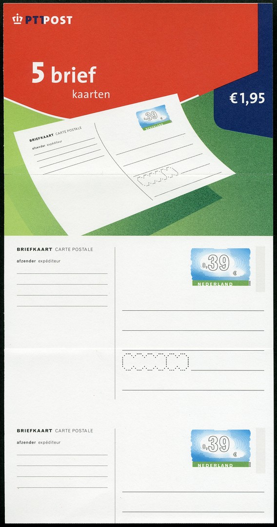 Briefkaart van € 0,39 afkomstig van cpl. strook van vijf ex. met curieuze foutdruk ´tevens op achterzijde bedrukt, maar dan verschoven´. Twee losse ex. waarvan een beschreven, en drie nog aan elkaar vastzittende ex.