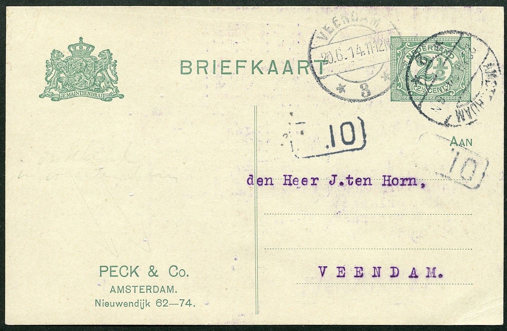 Particulier bedrukte bk. van Peck & Co. P80a-I-m zakelijk gebruikt, van Amsterdam 20-6-1914 naar Veendam