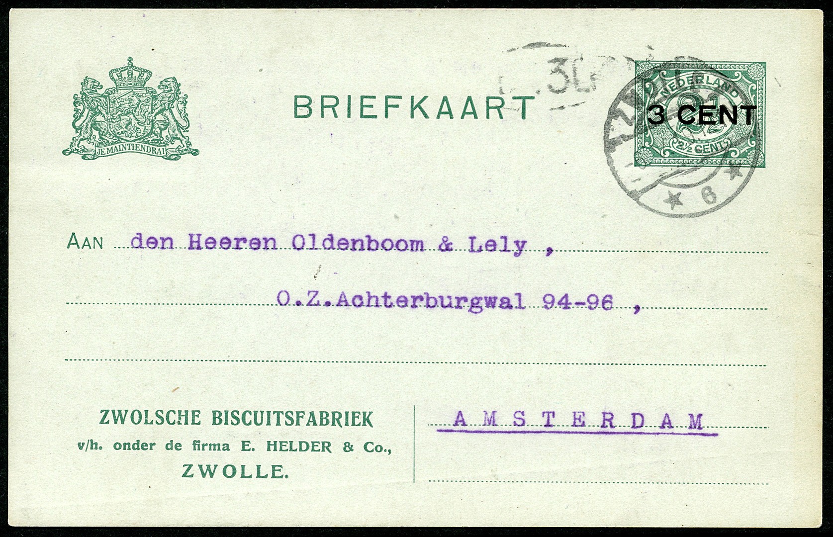 Particulier bedrukte bk. van de Zwolsche Biscuitsfabriek P96a-IIh zakelijk gebruikt, van Zwolle 6-5-1919 naar Amsterdam