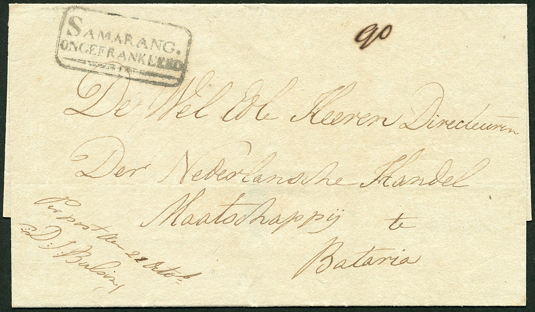 REMBANG, SAMARANG. Naamstempel waaronder ´Franco´ (WdB.253a) op Chinezenbriefje, alsmede tweeregelig naamstempel ´Samarang./Ongefrankeerd´ (WdB.270a) op gedateerde omslag van 21-10-1829 naar Batavia. Ex Wolff de Beer