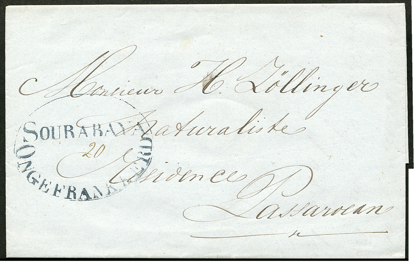SOURABAYA. Ovaalstempel ´Sourabaya/Ongefrankeerd´ in blauw (WdB.291b) op complete, zeer frisse vouwbrief van 25-9-1844 naar Passaroean (= Pasoeroean) met geschreven port ´20´ duiten. Superbe afdruk op uitzonderlijk mooie brief!