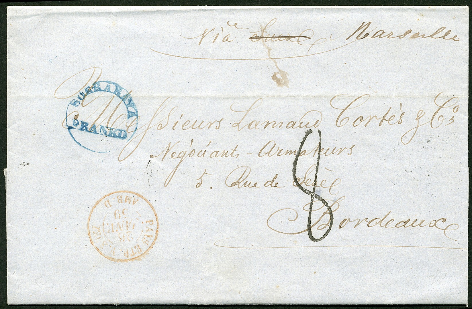 SOERABAYA. Cirkelstempel ´Soerabaya/Franko´ in blauw (WdB.349b) op complete, zeer frisse vouwbrief van 4-12-1858 via Marseille 26-1-1859 per traject Toulouse à Bordeaux 2-1 naar Bordeaux, met op vz. prachtafdruk ´Pays Étr. V.Suez/Amb. D´ (Salles 1.868) en Frans portstempel ´8´ centimes en op az. geschreven port ´30´. Prachtbrief!