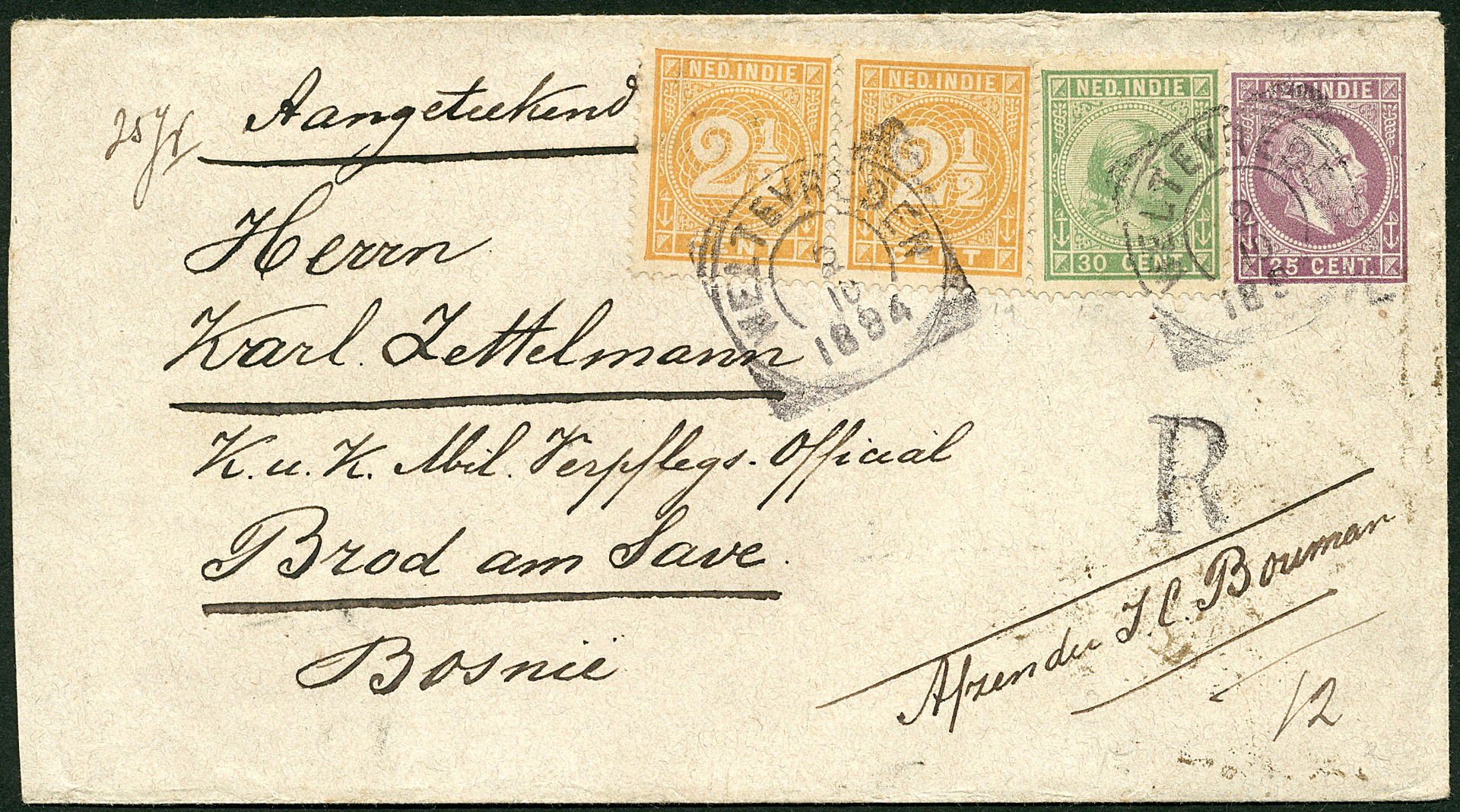 OOSTENRIJK-HONGARIJE. Env. G3c van 25 gr. bijgefr. met 30c Hangend Haar en 2½c (2x) van Weltevreden 2-10-1894 aangetekend over Genua 30-10 en Bologna 31-10 naar Brod in Bosnië 1-11. Mooie frankering, bijzondere bestemming