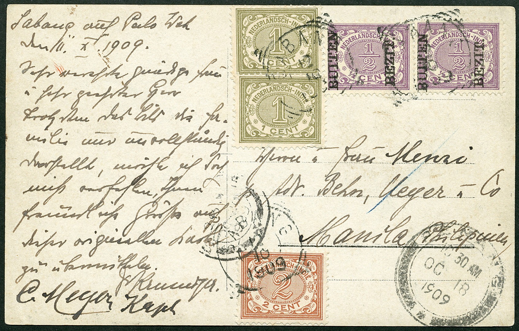 AZIË. FILIPPIJNEN. Fotoprentbk. gefr. met ½c BB (2x), 1c (2x) en 2c van Sabang 12-10-1909 over Penang en Singapore naar Manila