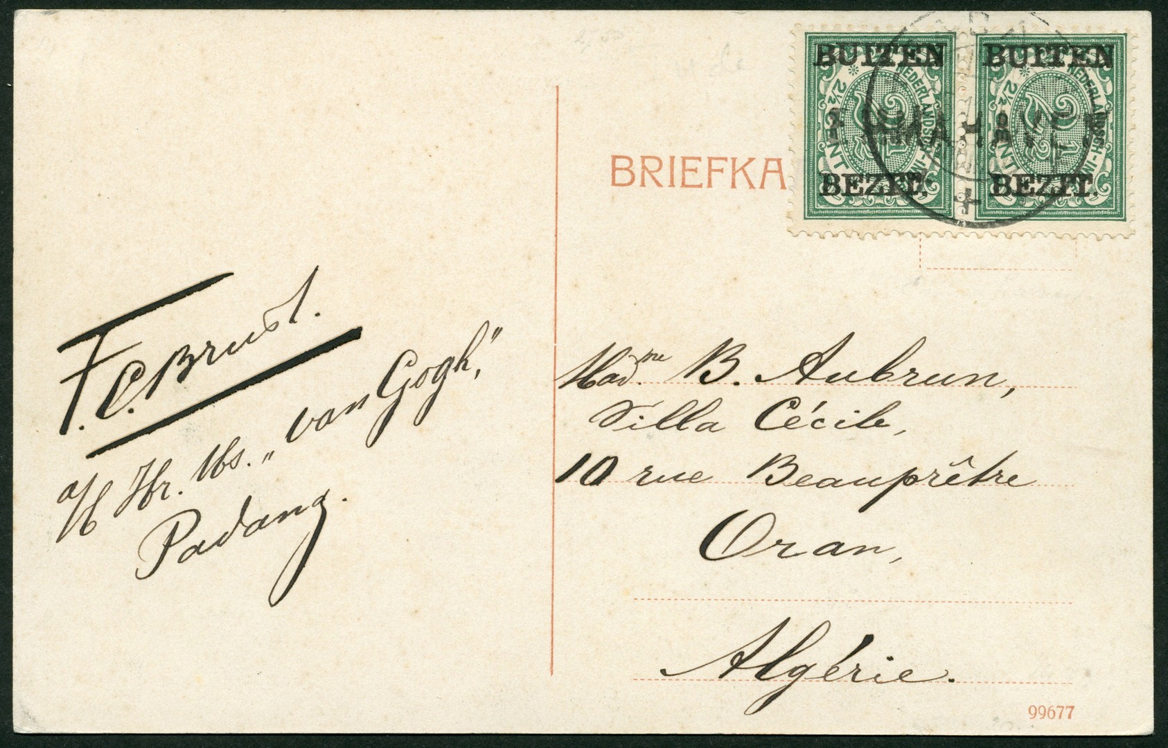 AFRIKA. ALGERIJE. Prentbk. gefr. met 2½c met BB-opdruk in paar, afgest. Emmahaven over Padang 25-11-1911 naar Oran