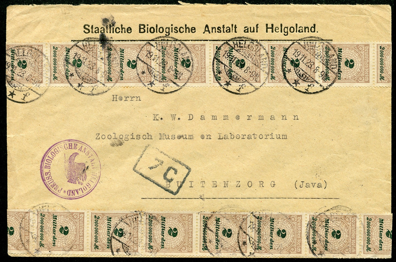 DUITSLAND. Env. van het ´Staatliche Biologische Anstalt auf Helgoland´ opmerkelijk beplakt met op vz. en az. twee stroken van elk rien zegels van 2 miljard mark, op 19-11-1923 naar een lab te Buitenzorg 20-12