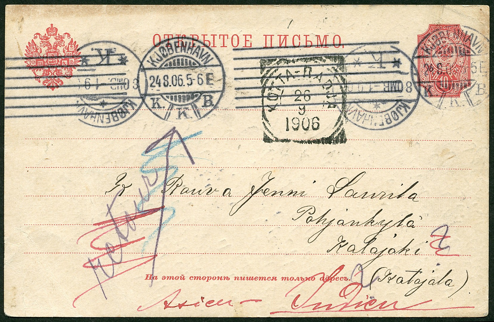 FINLAND. Bk. van 10p in het Fins geschreven en met als bestemming Kalajoki in Finland. Per abuis verz. naar Kopenhagen, vandaar op 24-8-1906 doorgez. naar ´Asien - Indien´ en afgest. te Kotta-Radja 26-9. Retour via Weltevreden 1-10 (az.) naar Kopenhagen. Uiterst curieus stuk