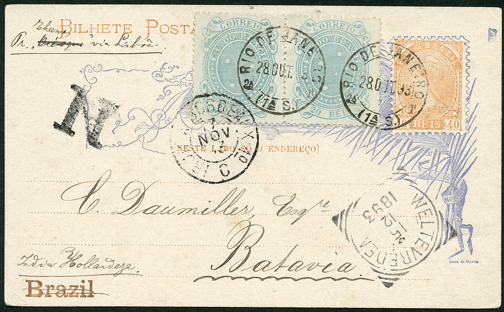 AMERIKA. BRAZILIË. Drie bijzondere poststukken, bk. van Rio naar Weltevreden (1893), postblad van Rio naar Koepang, doorgez. naar Amboina (1897) en prentbk. (vz. 1 zegel ontbreekt) van Sao Leopoldo over St. Thomas naar Padang (1904)