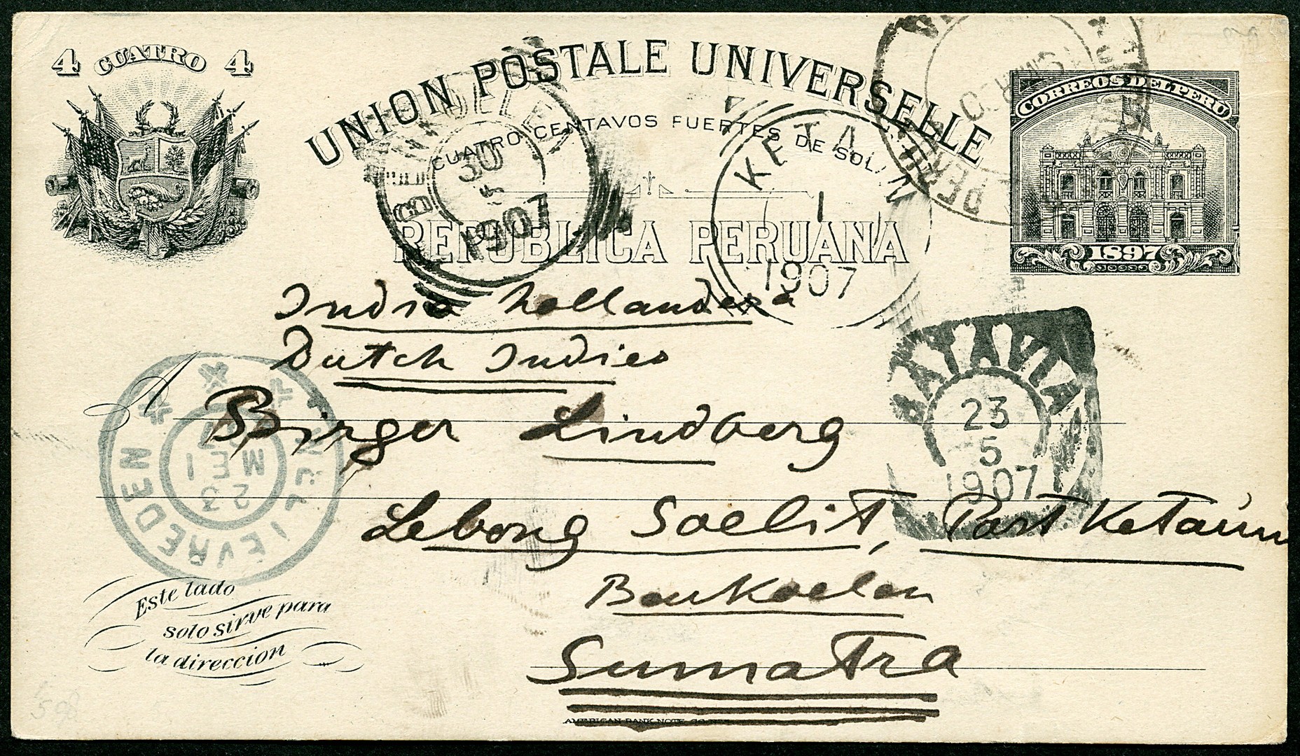AMERIKA. PERU. Bk. van Lima 19-3-1907 via Weltevreden, Batavia, Benkoelen en Ketaun 1-6 naar Lebong Soelit. Mooie kaart, versierd met Indische stempels