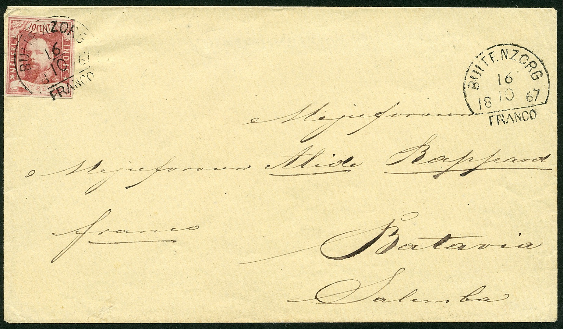 Halfrond-franco BUITENZORG op 10c nr. 1 op env. van 16-10-1867 naar Batavia 16-10. Prachtcouvert!